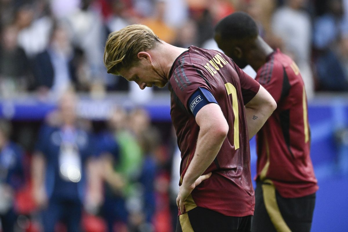 A belga Kevin De Bruyne a 2024-es németországi labdarúgó Európa-bajnokság nyolcaddöntõjében játszott Franciaország - Belgium mérkõzés után a düsseldorfi Merkur Spiel Arénában 2024. július 1-jén. A francia válogatott 1-0-ra gyõzött. MTI/Koszticsák Szilárd